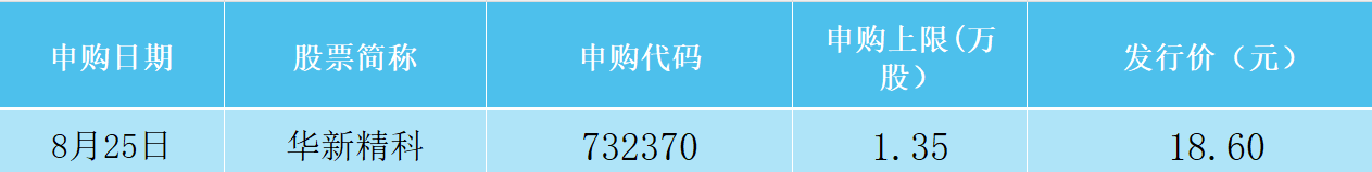 本周A股将有1只股票发行申购,是上证主板的华新精科(603370.SH)。