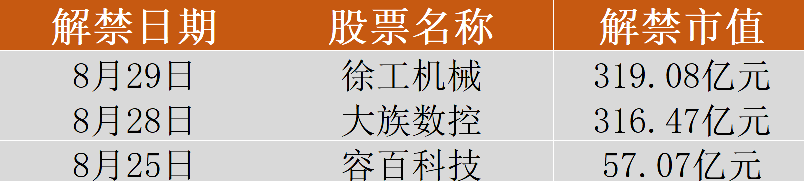 具体来看,8月25日,容百科技将解禁2.50亿股,为首发原股东限售股份;8月28日,大族数控将解禁3.59亿股,为首发原股东限售股份;8月29日,徐工机械将解禁35.69亿股,为定向增发机构配售股份。