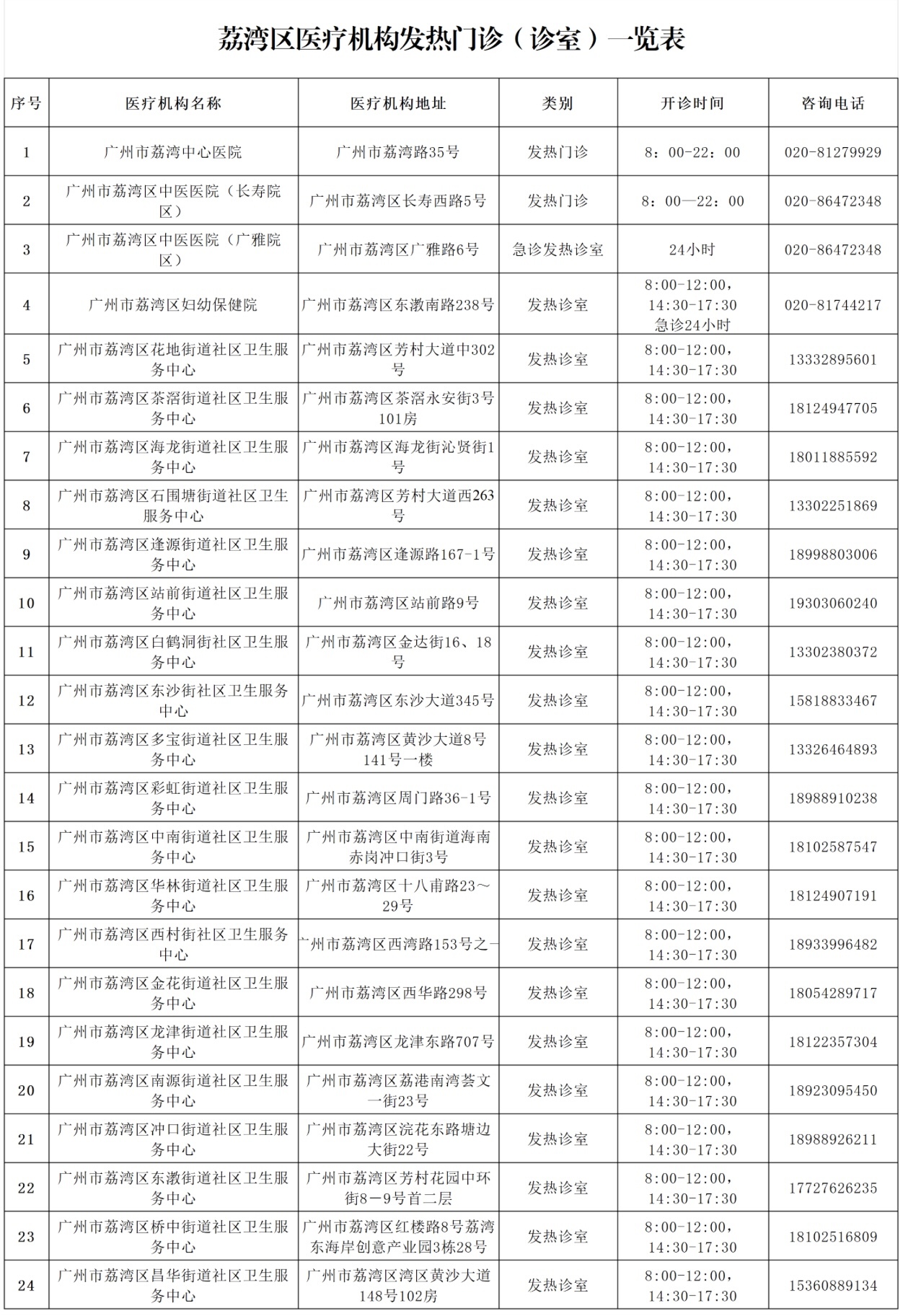 同时,荔湾区发热门诊(诊室)信息如下,患者前往就诊后,如经初筛疑似阳性,可直接通过荔湾区紧密型医疗集团上下转诊机制直转荔湾中心医院就诊。
