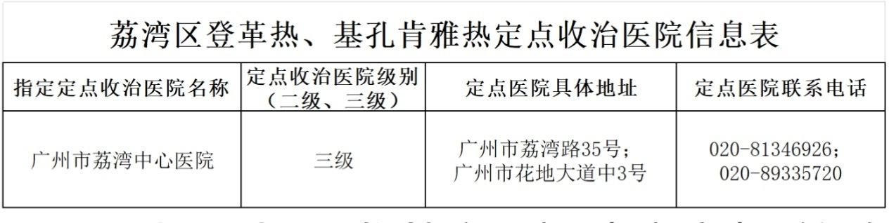 7月29日,荔湾区发布登革热、基孔肯雅热定点收治及发热门诊信息,若近期有基孔肯雅热和登革热流行地区和相关旅居史,一旦出现发热、皮疹、关节痛等症状,请及时前往定点医疗机构就诊(见下图),并主动告知医生近期的旅居史和蚊虫叮咬史,配合医生进行检查诊断。