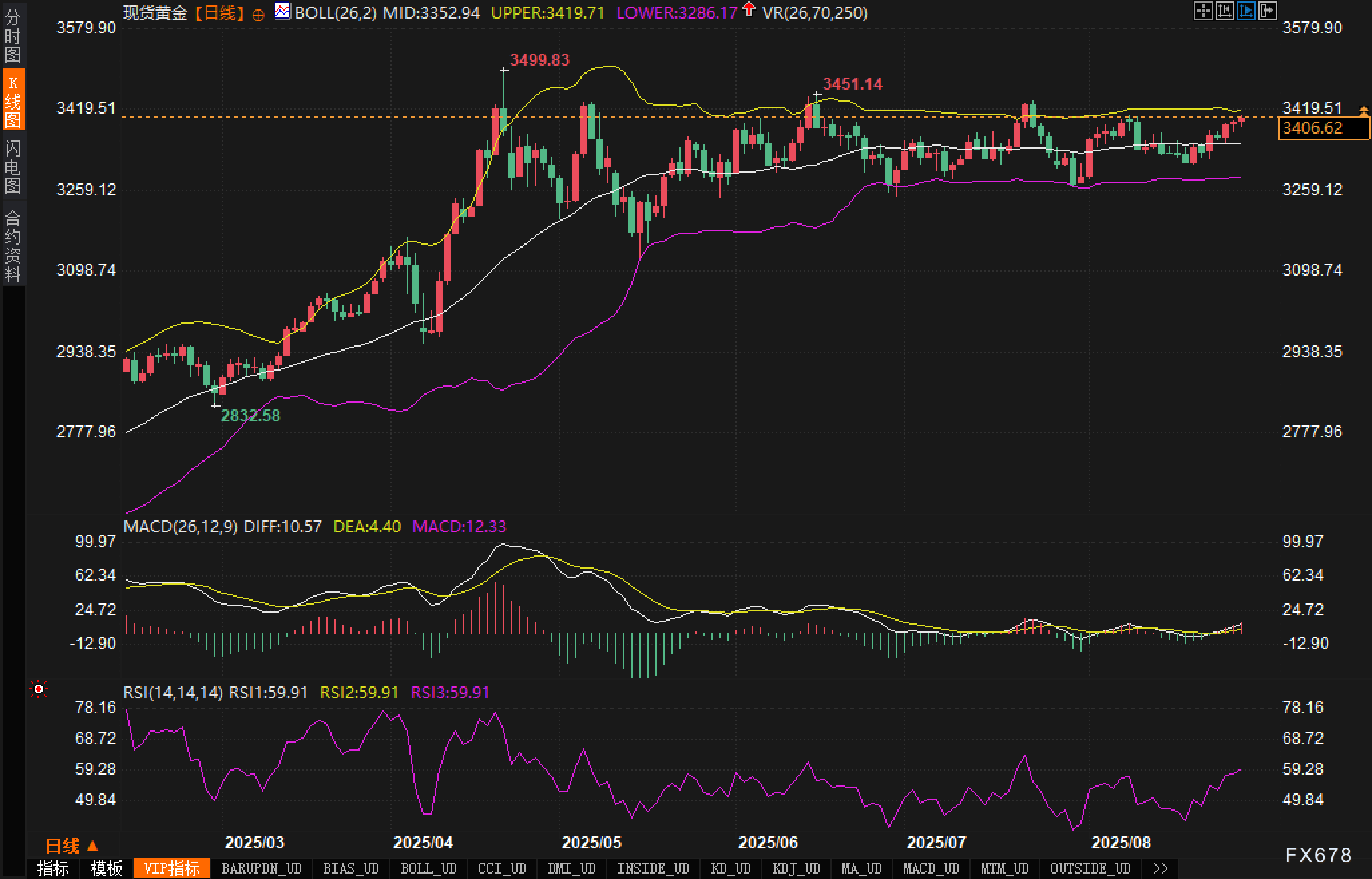 日线图显示,布林中轨位于3352.94,上轨3419.71,下轨3286.17;现价3406.62依旧贴近上轨运行。过去一个多月,价格在上轨与中轨之间拉锯,整体为横盘趋势下的上沿震荡。图中可见两个显著高点:3451.14与更高的3499.83,对应上方存量套牢区。布林带宽度明显收敛并形成阶段性“布林带挤压”,价格多次靠近上轨但未实现有效突破,显示多头动能充足但缺乏临门一脚。